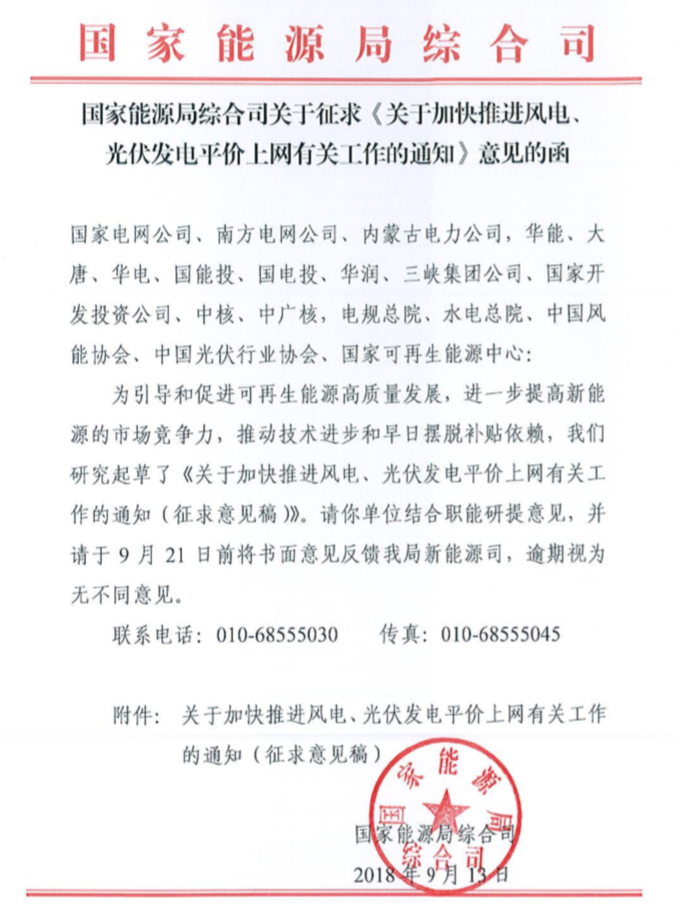 9月13日,国家能源局下发了《关于加快推进风电、光伏发电平价上网有关工作的通知(征求意见稿)》(以下简称“通知”)。