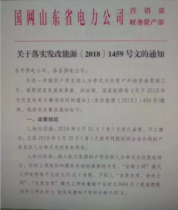12月13日,国网山东省电力公司营销部、财务资产部印发《关于落实发改能源【2018】1459号文的通知》,指出2018年5月31日(含)之前已备案、开工建设,且在2018年6月30日(含)之前并网投运的合法合规的户用自然人分布式光伏发电项目,标杆上网电价和度电补贴标准保持不变。