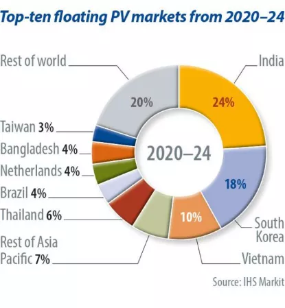 IHS Markit预计,在在未来5年,亚洲将占到漂浮电站装机总数的70%以上。其中,预计最大的三个市场将是印度、韩国和越南。如果开发和并网持续按计划进行,这三个国家的装机容量将占到总装机容量的一半以上。
